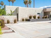 A view of a modern architectural residential building in Palm Springs, California. The building stands out against the clear sky and features a palm tree-lined driveway leading to a parking lot. The mid-century design reflects the suburban charm of the area.