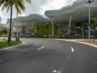 A modern building stands tall on a road in Miami, Florida. Large palm trees and other decorations adorn the entrance, offering a glimpse of urban design. Clear skies and hard shadows create a vibrant scene.