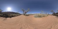Panoramic view of the rugged desert landscape in Utah, USA. Red rock formations contrast with the clear sky. Trees and shrubs dot the sandy terrain. A straight road leads into the wilderness of Comb Wash Entry.