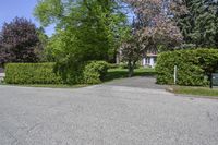 This is a panoramic view of a residential area in Toronto, Canada. The image shows a road with asphalt surface surrounded by houses and properties. The well-maintained grass and trees add to the picturesque landscape. In the foreground, there is a woody plant hedge and a shed in a land lot. The clear sky above provides a bright backdrop. This photo represents the peaceful and suburban feel of the residential neighborhood in Toronto, showcasing the beauty of the real estate and the well-kept gardens and driveways.