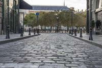 A classic architecture building in Paris, France. The straight road leads to a bustling city neighborhood. Cobblestone road surfaces add to the charm of this European city. A perfect blend of urban design and city life.