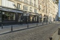 This image showcases the charming streets of Paris, France during the early morning hours. The classic architecture of the buildings is accentuated by the cobblestone road surface and the shadows cast by the low-dawn sun. The pedestrian-friendly neighborhood is filled with a mix of shops, cafes, and restaurants, creating a vibrant city life. The facades of the buildings are adorned with columns, adding to the architectural charm. This photo captures the essence of urban design and the tourism experience in Europe's beloved city of Paris.