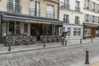 A picture of a charming Parisian café on a cobble stone road in France. The classic architecture and inviting façade capture the essence of city life in Europe. Perfect for a leisurely breakfast or an evening meal.
