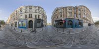 A 360-degree view of a city intersection in Paris, France. Classic architecture lines the streets, with buildings on either side. The bustling city life and vibrant storefronts make it a popular tourist destination.