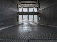 This is an image of a modern building in a metropolitan area of Germany. The architecture features straight lines, rectangles, and a monochromatic color palette, highlighting a sleek and contemporary design. The concrete street leads to a parking deck, showcasing the city's infrastructure. Windows, walls, and ceilings create a symmetrical and artistic composition. The open space and water element add a sense of tranquility to the bustling city. This photo captures the essence of modern European architecture and the blend of art and functionality in urban spaces.