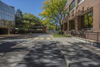 A sunny day in Toronto's urban neighborhood with clear skies. The asphalt road leads to a parking deck with glass walls. The surrounding trees and vegetation provide shade and create a pleasant open space.