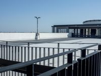 This image captures a modern architectural building in Berlin, Germany. The clear sky and winter setting provide a backdrop for the sleek facade and unique design of the structure. The lines, stairs, and guard rails create an interesting composition, while the shadows add depth and dimension. A walkway with a handrail leads to the building, with a parking deck and garage visible in the background. This photo represents the modern architecture and urban landscape of Berlin, a city known for its innovative design and European charm.