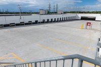 This stock photo features an empty parking lot in Toronto, Canada. The parking lot is devoid of cars and a prominent 'No Parking' sign can be seen on the railing in front. The urban setting of the city is reflected in the surrounding concrete surfaces and open spaces. The photo was taken during the day, with clouds visible in the sky. This image captures the urban design and city life of Toronto.
