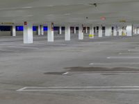 a parking lot with many parked cars and white columns with colorful signs hanging off the ceiling