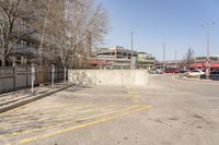 This is an image taken in Toronto, Ontario, Canada. It shows a clear sky with a residential neighborhood in the background. The foreground features a parking lot and a road with parked cars and a streetlight. The asphalt road surface leads to a concrete street, while a tree and a house can be seen on the side. The image captures a typical day in a residential area of Toronto, showcasing the infrastructure and street elements such as crosswalks, curbs, and entry points. It represents the urban landscape of Toronto, Ontario.