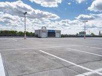 This stock photo showcases the modern architecture in Berlin, Germany. It features a parking lot with a store front and plenty of parking spaces. The image was taken on a partly cloudy day, adding a touch of ambiance to the scene. The surrounding landscape includes trees, creating a pleasant atmosphere. The road surface is made of asphalt, providing a smooth drive. The open space and clear sky contribute to the overall spacious and bright feel of the photo. The concrete street, public space, and parking deck highlight the urban environment. The image also features light poles and street lights, enhancing the visibility and safety of the thoroughfare. Overall, this photo captures the essence of a busy city street with ample parking options.