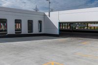 This stock photo shows an empty parking lot in Toronto, Canada. The city's urban design is evident in the concrete surfaces and yellow line across the sidewalk. The image captures a cloudy day in the city, highlighting the urban atmosphere and city life. The parking lot appears spacious and well-maintained, providing ample parking space for urban dwellers. This image can be used to represent urban infrastructure, city planning, or urban transportation.