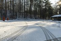 A sunny day in Toronto's rural landscape. The straight road cuts through the snowy forest, surrounded by woody plants and vegetation. The clear sky and sunshine create a picturesque scene. A parking lot is visible as a destination for outdoor activities.