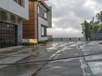 This stock photo showcases a beautiful paved patio in Los Angeles, California. The patio is located near a modern architecture building, with subtle concrete and wood details on the outside of the house. The open space and day sky provide a tranquil atmosphere, while a low cloud adds a touch of drama to the scene. The patio is a perfect spot for relaxation and enjoyment, surrounded by trees and a wet road surface. This image is ideal for showcasing real estate, residential areas, and the urban lifestyle in Los Angeles.