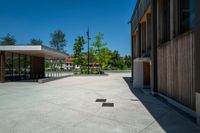 This stock photo depicts a beautifully designed open space in the old town of Colmar, France. The image showcases a paved concrete plaza with benches and trees, creating a charming urban atmosphere. The clear sky adds a refreshing touch to the picture. The city's urban design can be seen in the arrangement of the plaza and the surrounding buildings. The surface of the plaza is made of asphalt, providing a smooth and clean surface for pedestrians. This image captures the essence of urban life and the architectural beauty of Colmar, France.