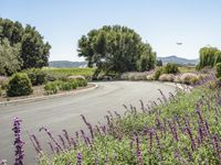 This stock photo depicts a beautiful scene in the rural countryside of California, USA. A paved road winds its way through fields of colorful flowers and trees, surrounded by majestic mountains in the distance. The landscape is low and dotted with vegetation, creating a serene and natural environment. The clear sky above complements the vibrant purple flowers, including lupine and lavender, in the foreground. This image is perfect for showcasing the beauty of nature and the wilderness in California.
