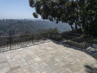This stock photo features a paved walkway that stretches into the distance, near trees and hills in Los Angeles, California. The walkway is made of cobble stone and is surrounded by residential properties. It offers a picturesque view of the mountain landscape and nature. The clear sky provides the perfect backdrop for this classic architecture. The high-floor walkway is elevated and offers an overview of the land lot. This scenic spot is located near Beverly Hills and Hollywood Hills, making it a popular destination for recreation and leisure activities. It is an ideal location for real estate and property enthusiasts to admire the beauty of this area.