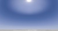 a person is standing on the desert looking up at a bright blue sky and the sun behind them
