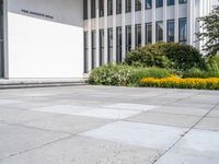 A person skateboards in the cement near flowers and bushes outdoors a building and white tiles in Berlin, Germany. The modern architecture and open space create a pleasant atmosphere in this university campus. The clear sky highlights the wall of glass, giving the office building a sleek and modern look. This architectural masterpiece is situated in the heart of Europe, in the vibrant business district of Berlin. It is a perfect blend of business, art, and culture, with a museum nearby and surrounded by financial institutions.