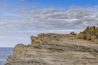 This stunning stock photo captures a breathtaking coastal landscape as a person stands on the edge of a cliff, gazing out at the vast ocean. The rocky bedrock surface and rugged terrain provide a dramatic backdrop for the scene. In the early morning light, the grey sky and clouds create a gloomy and mysterious atmosphere. A dog can be seen relaxing on the cliff, adding a touch of companionship to the open space. The image showcases the beauty of the untouched natural surroundings, showcasing the unique blend of vegetation, dirt, and gravel that make up this cliffside location.