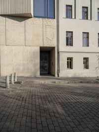This stock photo features a person in a blue jacket walking down the street near modern architecture buildings in Berlin, Germany. The buildings have no windows on them, giving them a unique facade. The city is bustling with city life, with office buildings and businesses surrounding the area. The road surface is made up of cobble stones, adding to the charm of this urban neighborhood. This image perfectly captures the urban design and material property of the buildings in Berlin, making it suitable for various editorial and commercial purposes.