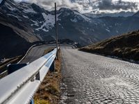 A picturesque drive along a winding mountain road in Austria. The road, surrounded by breathtaking landscape, curves through highlands and slopes. Clear skies and fluffy clouds add to the natural beauty of the scene.