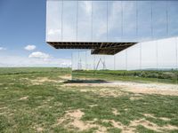 This image showcases a modern architecture installation in Germany, set against a lush green grass field and a clear blue sky. The mirrored room reflects the surrounding landscape, creating a unique visual effect. The swings in the foreground add an element of playfulness to the scene. This artwork blends seamlessly with the natural environment, blending art and nature. With its open space and rural setting, this sculpture creates a serene and tranquil atmosphere. This photo captures the beauty of the European countryside and the harmonious relationship between architecture and nature.
