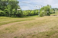 A picturesque rural landscape in Ontario, Canada. Lush green open spaces with scattered trees and grassy fields provide a natural environment for recreational activities. Overhead power lines run across the land. Perfect for a day of outdoor sports near Toronto.