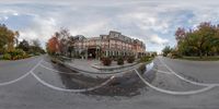 A beautiful residential area in Toronto, Ontario. Classic architecture and straight road lined with trees create a picturesque scene. The grey sky adds a touch of gloom, capturing the essence of autumn in Canada.