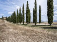 A scenic rural road winding through the lush landscape of Tuscany, Italy. Green fields, rolling hills, and rows of cypress trees create a picturesque natural environment. A perfect destination for recreational activities and immersing in the beauty of Europe.