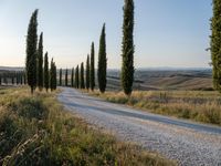 A peaceful rural landscape in Tuscany, Italy. The dawn sky is clear, revealing the rugged beauty of the countryside. A gravel road meanders through the picturesque scenery, lined with cypress trees. A harmonious blend of nature and tranquility.
