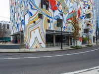 a tall multicolored building next to the road in the city with a large painted mural on it's side