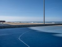 A sunny day in Porto, Portugal, with clear skies and hard shadows casting on the coastal open space. Beach basketball court by the ocean with shadows creating a striking contrast.