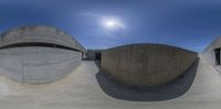 the view of a skateboard ramp in a concrete building under a clear blue sky