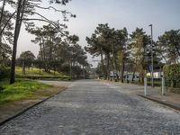Straight road in Porto, Portugal, lined with cobblestone in a residential area. Clear skies cast hard shadows on the ground. A typical day in Europe's charming Porto.