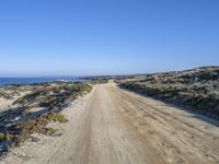 A scenic coastal road in Portugal, surrounded by sandy beaches and clear blue water. The straight road leads to a picturesque horizon, with a clear sky overhead. The landscape showcases the natural beauty of this European country.