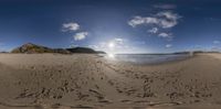 a camera lens view of a beach and sky with tracks in the sand in front of the beach