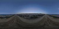 a dirt covered ramp next to a beach during the day with a blue sky behind it
