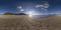 a camera lens view of a beach and sky with tracks in the sand in front of the beach