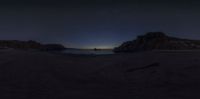 a dark and gloom looking picture of an ocean at night time and moon rise above rocks