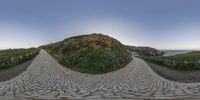 A coastal landscape in Portugal at dawn. The straight road leads to a building surrounded by lush vegetation. The clear sky reflects on the calm ocean. The fisheye lens effect adds a unique perspective.