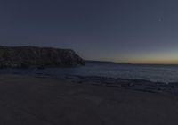 A peaceful night scene along the coastal waters of Portugal. The dark horizon contrasts with the clear sky above, illuminating the serene landscape. Waves gently crash onto the beach, creating a calming rhythm.