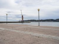 A calm coastal scene in Lisbon, Portugal. Grey cloudy sky above an open space with cranes on a pier. The road and street lights lead the way to the tranquil ocean horizon.