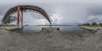 A tranquil coastal scene in Lisbon, Portugal at dawn. The pier stretches out into the calm ocean, offering a straight view down the road. The man and his dog enjoy the serene open space.