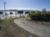 This is an image of a coastal landscape in Lisbon, Portugal. The clear sky above reflects on the calm waters of the ocean, creating a serene and peaceful scene. The grassy road surface leads to a bank of bushes and trees that line the coast. Natural vegetation and bird species can be observed along the coastline, adding to the beauty of the scene. In the distance, a street light illuminates the land lot, providing a warm and inviting atmosphere. This photo captures the natural beauty of Lisbon in Europe.