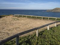 A parking lot located along the coastal terrain in Portugal. The sandy surface is bordered by a wooden fence and guard rail. Azure ocean and clear sky create a picturesque backdrop.