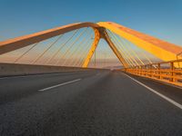 A stunning view of Prat Bridge at dawn in Barcelona, Spain. The sky is clear and there is low light from the break of day. The bridge is made of asphalt and stretches across a picturesque road. This photo captures the beauty of Europe in Barcelona.