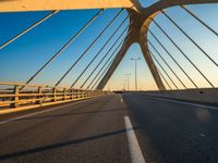 A long bridge that stretches over a river in Barcelona, Spain. The bridge is made of asphalt and there is a clear sky in the background. The image captures the break of day with a beautiful dawn light. This bridge, known as Prat Bridge, is part of the road network in Europe. The photo was taken from a low angle, capturing the straight road leading to the bridge.