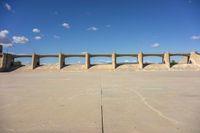 This is an image of a concrete bridge in Los Angeles, California, USA. The bridge spans over an open space with a dirt field below. The concrete walls of the bridge create a profile against the clear sky. The image showcases the straight road and the concrete surface of the bridge. The surrounding landscape and the clouds above add to the overall composition. This photo represents an urban scene in Los Angeles on a sunny day.