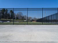 Profile view of an iron gate in a parking lot. Clear sky contrasts with the concrete surface. Empty stadium with no wheels or people behind. A glimpse of a deserted football stadium on a sunny day.